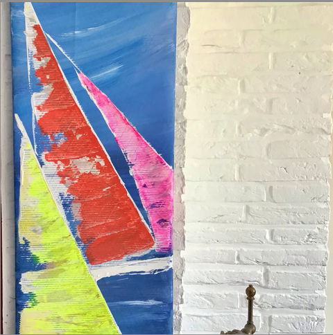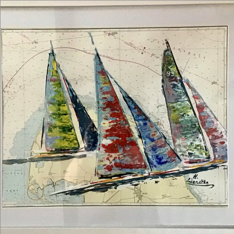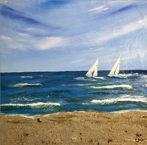 Es kommt immer wieder vor, dass ich bei meinen Arbeiten Ostseewasser, Strandsand oder Segelstoff verwende. Den ausgemusterten Segelstoff verwende ich als Leinwand, somit erfährt das Material ein herrliches Upcycling und erzählt auch die Geschichte der Segelei immer ein Stück weiter.